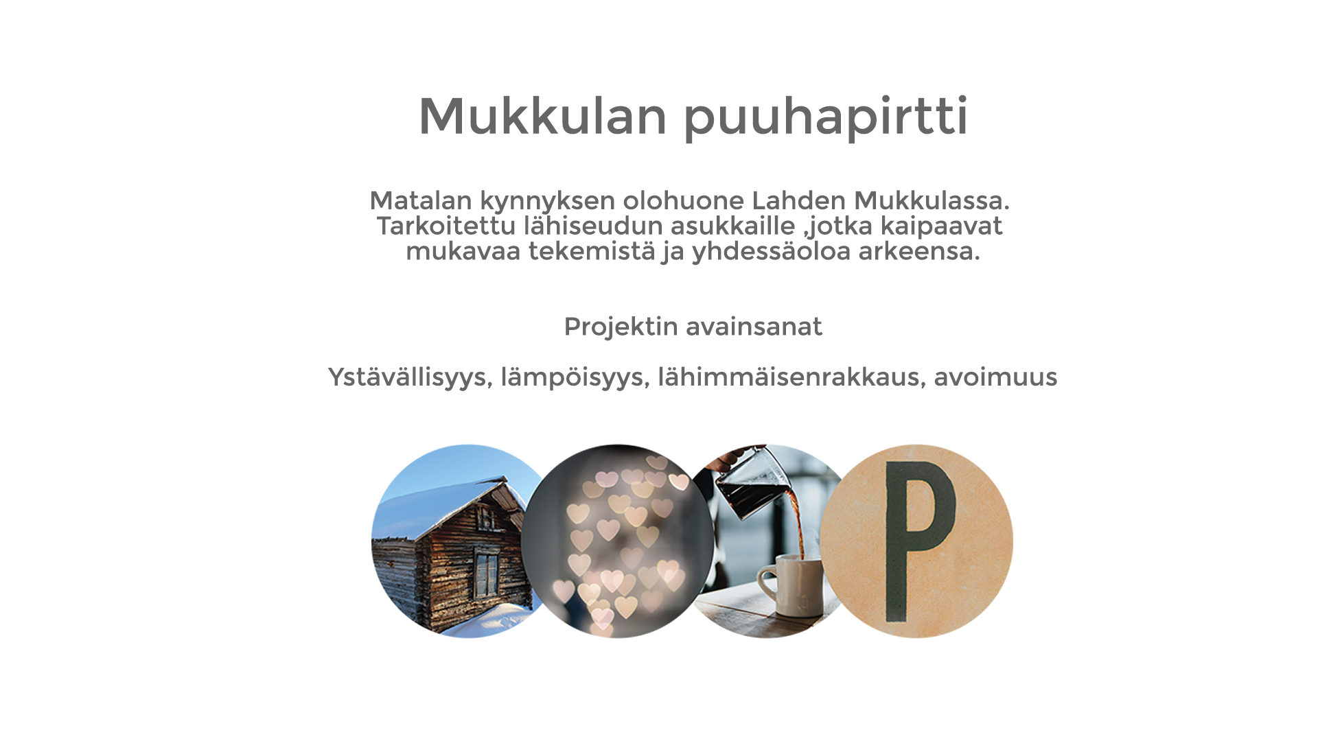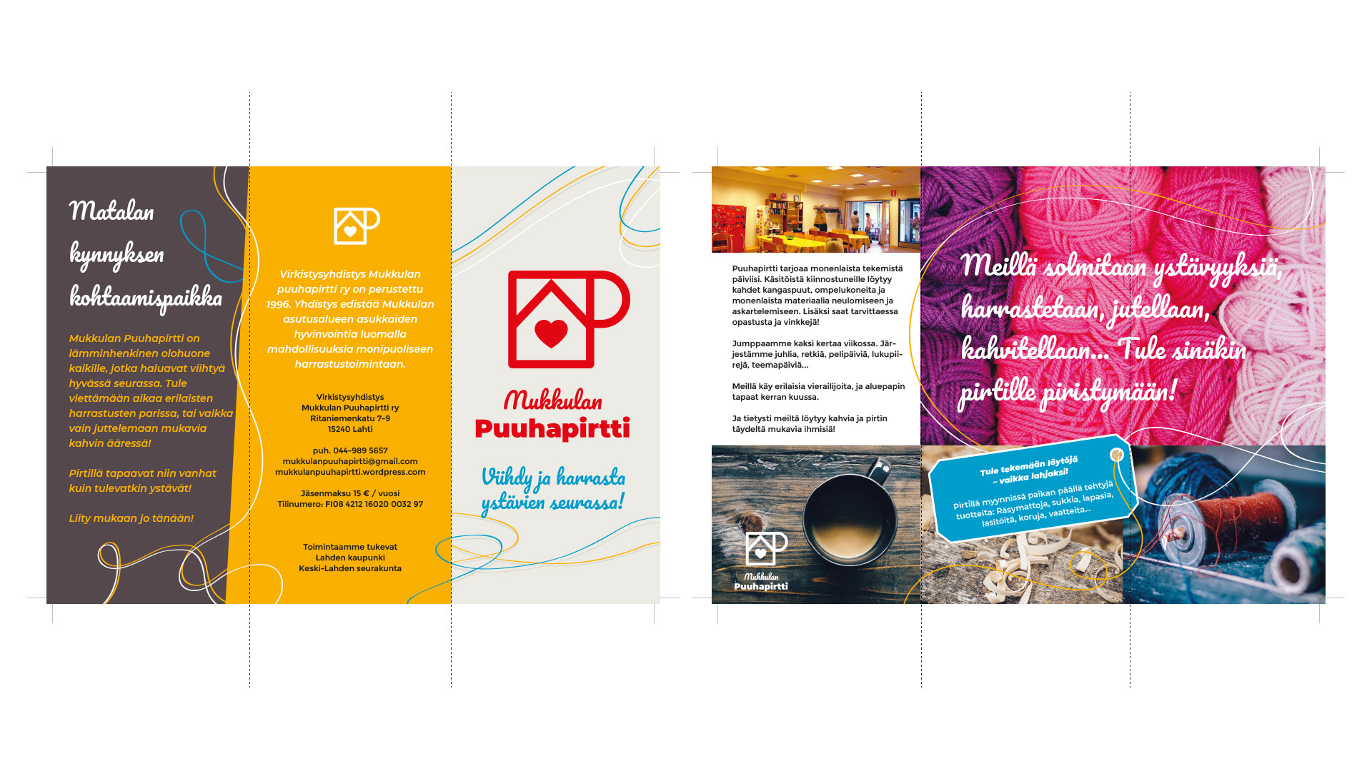 - Mukkulan Puuhapirtti. Logo, house style, brochure for a residents' association in city of Lahti.